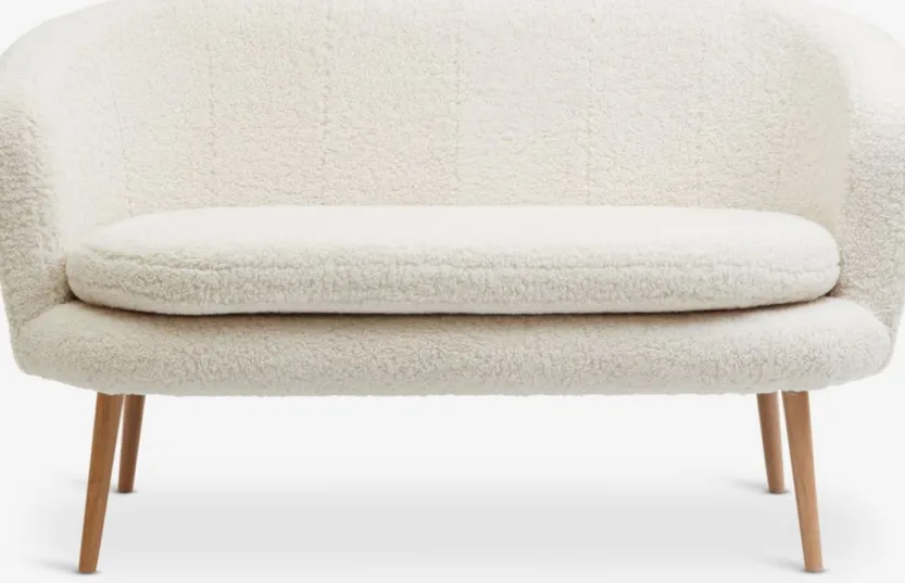 2-zitsbank van teddy stof. Zit en rugkussens van schuim. Poten van massief hout. B137 x H78 x D76 cm