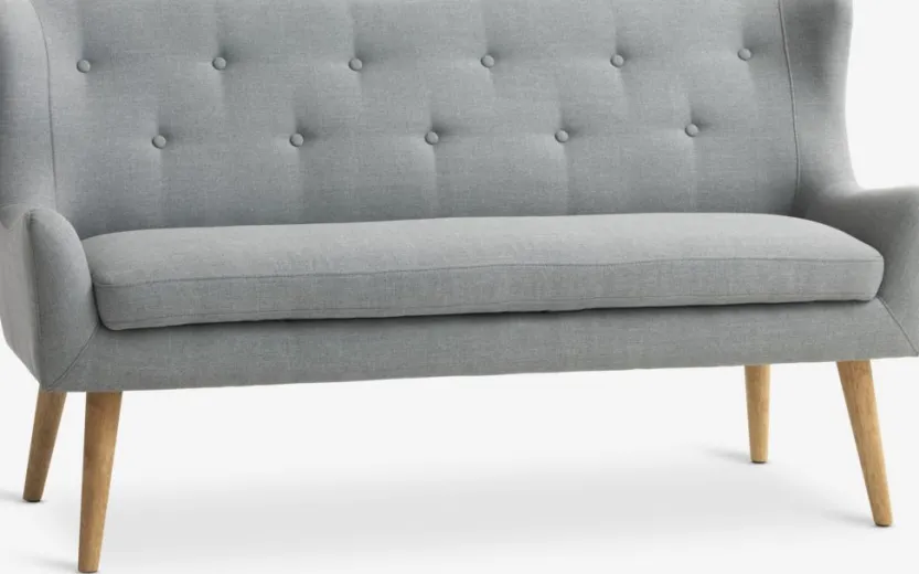 2-zitsbank van stof. Rug- en zitkussens van schuim. Poten van massief hout. B158 x H90 x D68 cm
