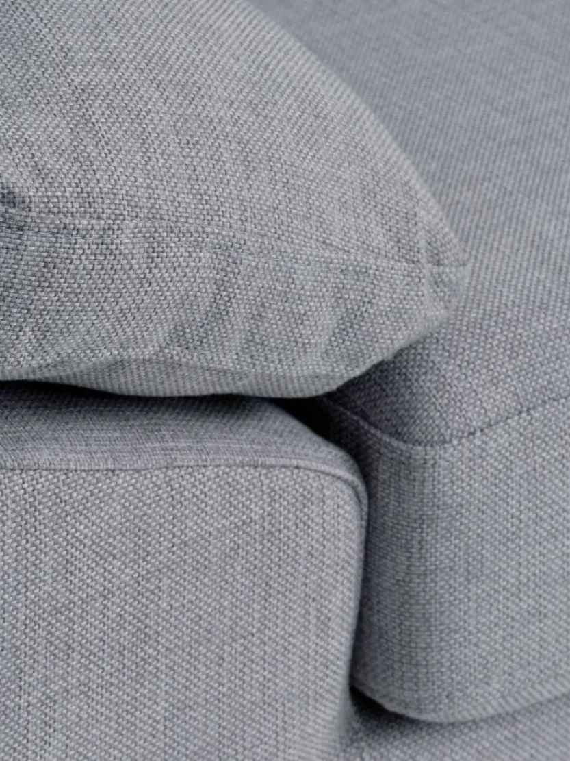 3-zitsbank van stof. Zitkussens met pocketveren en schuim. Rugkussens van schuim. Poten van massief hout. Kan niet worden gespiegeld. B211 x H85 x D84/141 cm