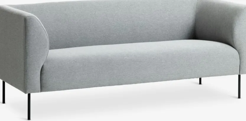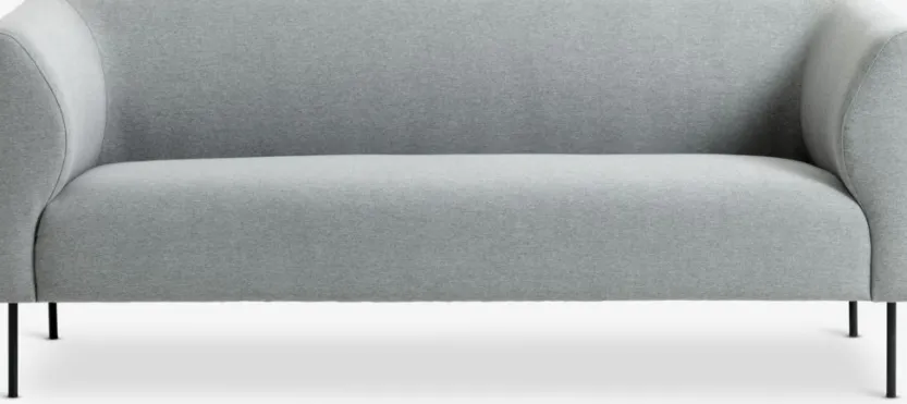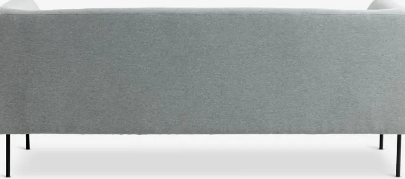3-zitsbank van stof. Rug- en zitkussens van schuim. Poten van staal. B185 x H74 x D76 cm