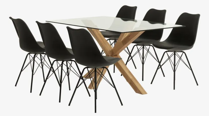 Tafel: Massief eiken en gehard glas. B90 x L160 x H75 cm. Stoel: Voorgevormde zitting en staal. Met vast kunstleren kussen.