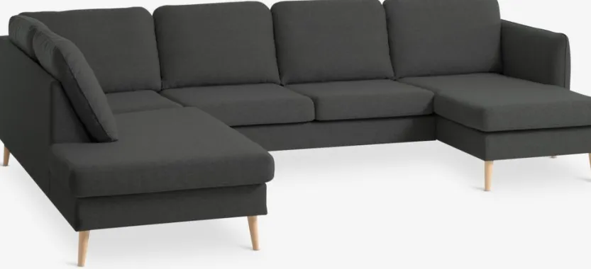 6-zits hoekbank van stof. Zit- en rugkussens van schuim. Poten van massief beuken. Kan niet worden gespiegeld. B294 x H82 x D82/137/201 cm