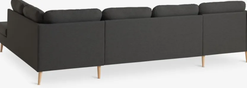 6-zits hoekbank van stof. Zit- en rugkussens van schuim. Poten van massief beuken. Kan niet worden gespiegeld. B294 x H82 x D82/137/201 cm