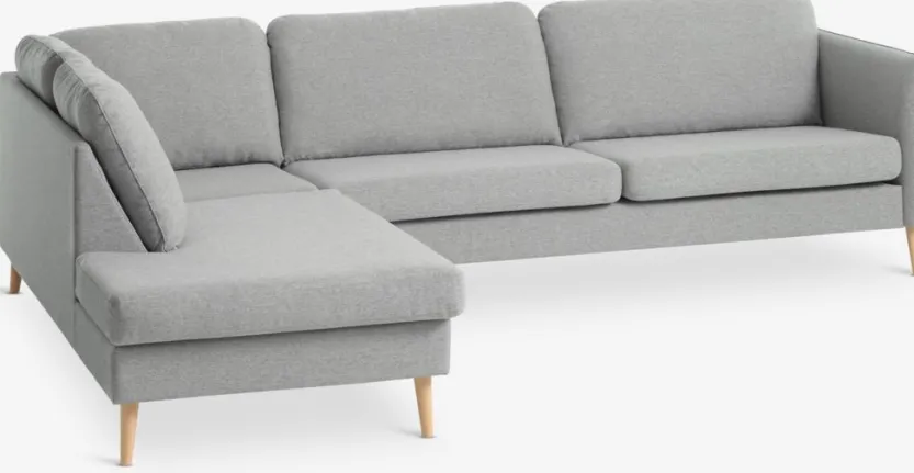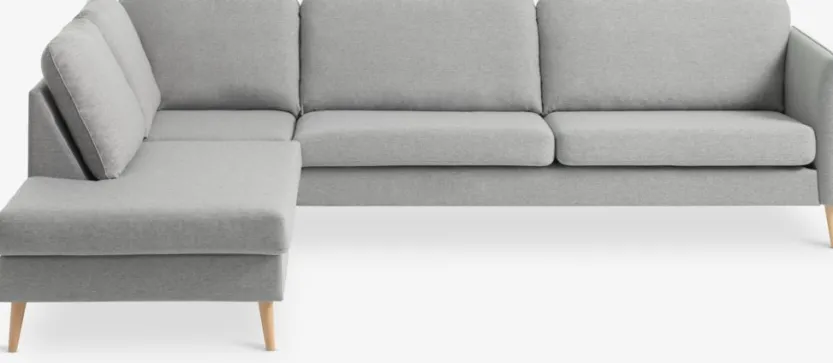 4-zits hoekbank van stof. Zit- en rugkussens van schuim. Poten van massief beuken. Kan niet worden gespiegeld. B273 x H82 x D82/201 cm