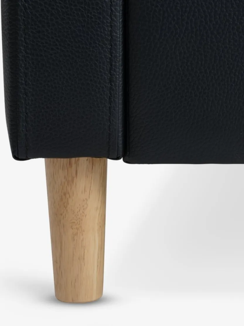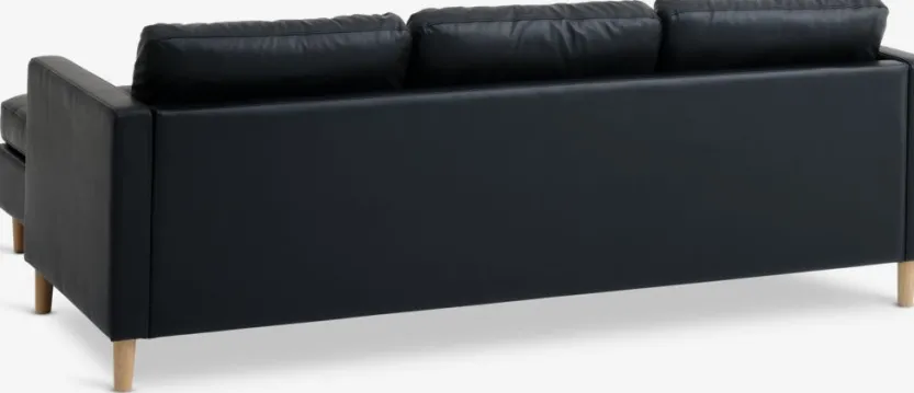3-zitsbank in kunstleer. Zit- en rugkussens in schuim. Poten uit massief hout. Kan worden gespiegeld. B216 x H78 x D83/149 cm