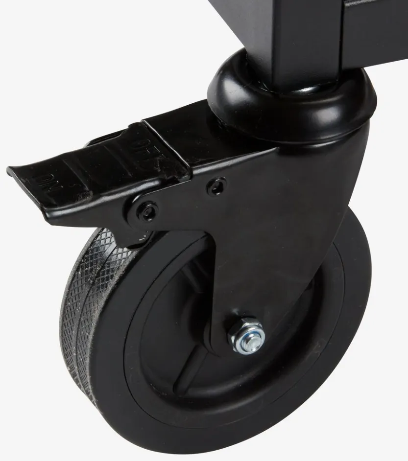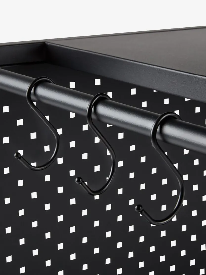 Zwarte barbecuetafel met een poedergecoat stalen frame en tafelblad. Kan worden gebruikt als basis voor een tafelgasbarbecue en is ideaal voor het organiseren van gereedschap en benodigdheden bij het buiten koken. De 2 wielen maken het gemakkelijk om de tafel te verplaatsen. Incl. 6 haken. B50 x L90 x H84 cm