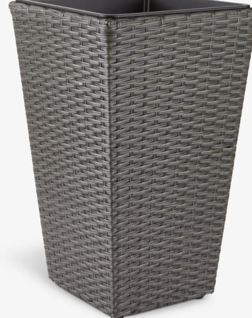 Grijze plantenbak van polyrattan en poedergecoat staal. Deze lichtgewicht, vorstbestendige plantenbak is ideaal voor het tentoonstellen van alle soorten planten in buitenruimtes. Een afvoergat kan gemakkelijk worden gemaakt zodat overtollig water kan wegstromen. B31 x L31 x H50 cm