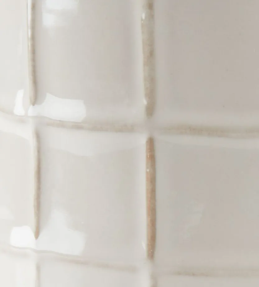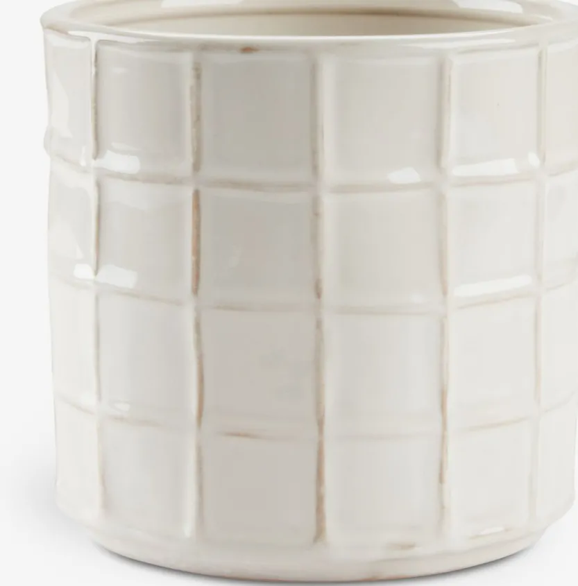 Witte bloempot van aardewerk met een vierkant patroon. Deze stijlvolle bloempot voegt een moderne touch toe aan elk interieur. Ø14 x H13 cm.