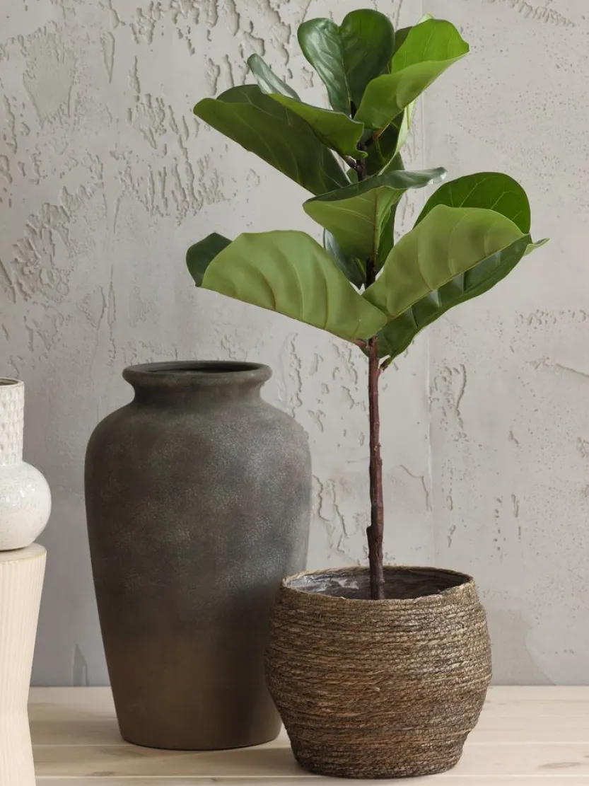 Ronde bloempot gemaakt van donkerbruine kogelbies met een plastic voering. Het materiaal voegt een vleugje natuur toe aan je interieur. Kan ook worden gebruikt voor decoratieve opslag. Ø26 x H23 cm
