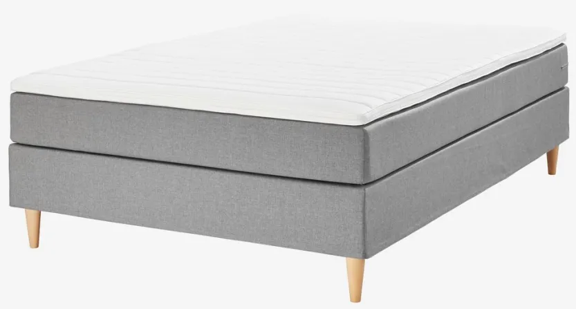 1 omkeerbaar springveermatras 140×200 cm met bonellveren 110/m², gevoerd met polyetherschuim. 1 topmatras, 4 cm dik met een kern van polyetherschuim. Wasbare stretch tijk met een dikke voering. De basis bestaat uit 1 frame. Incl. poten. Excl. hoofdbord.