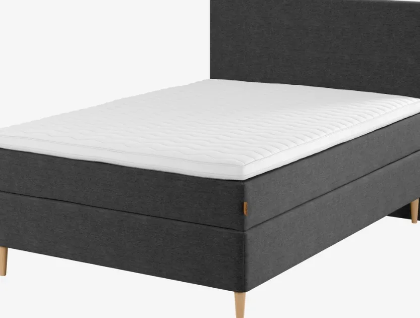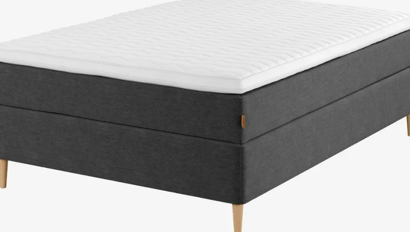 Boxspring 140×200 cm. 1 omkeerbaar springveermatras met pocketveren 260/m², gevuld met polyetherschuim. Het matras is verdeeld over 7 comfortzones die een unieke, ergonomisch correcte ondersteuning bieden. 1 topmatras, 7 cm dik met een kern van polyetherschuim. Wasbare tijk met een zachte, dikke voering. De basis bestaat uit 1 boxmatras met pocketveren 205/m². Incl. poten. Excl. hoofdbord.