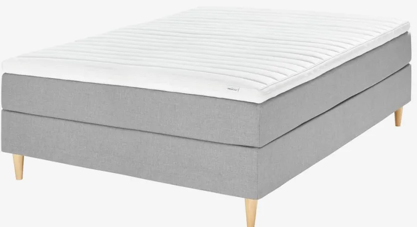 Kwaliteitsvolle boxspring 140×200 cm. 1 omkeerbaar springveermatras met pocketveren 250/m², gevoerd met polyetherschuim. 1 topmatras, 7 cm dik met een kern van polyetherschuim. Wasbare stretch tijk met een zachte, dikke voering. De basis bestaat uit 1 frame. Incl. poten. Excl. hoofdbord.