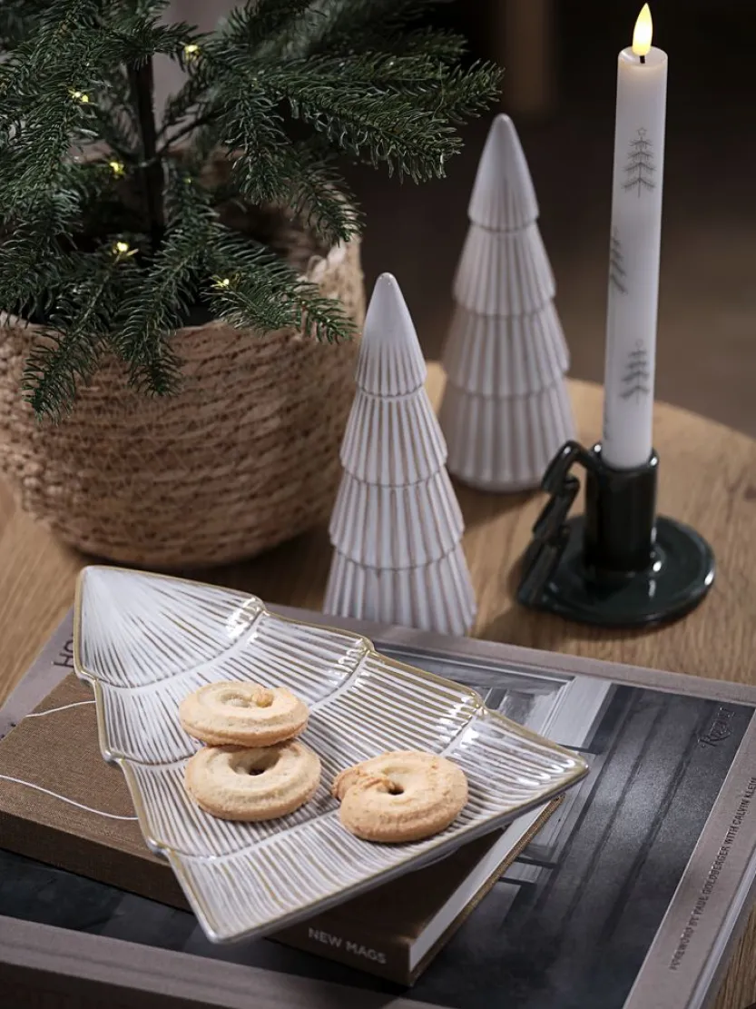 Witte decoratieve schaal in de vorm van een kerstboom. De schaal heeft een subtiel lijnpatroon dat een elegante uitstraling geeft. Ideaal voor het presenteren van droog voedsel tijdens de feestdagen. Geschikt voor de vaatwasser. B25 x L18 x H2 cm