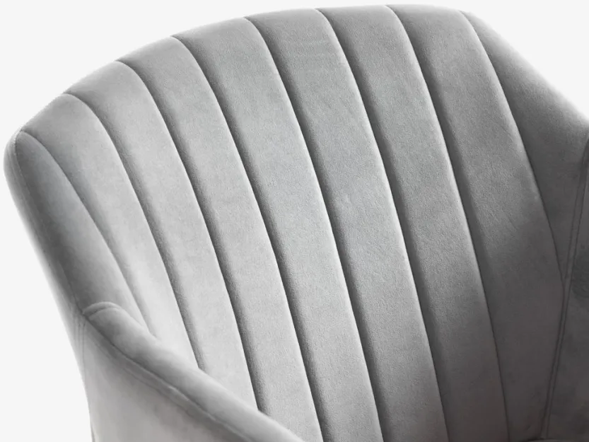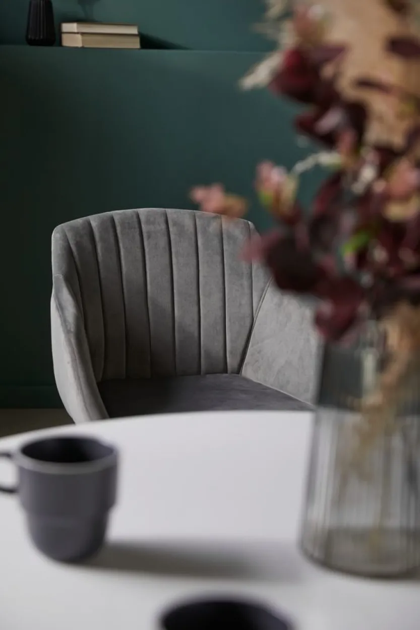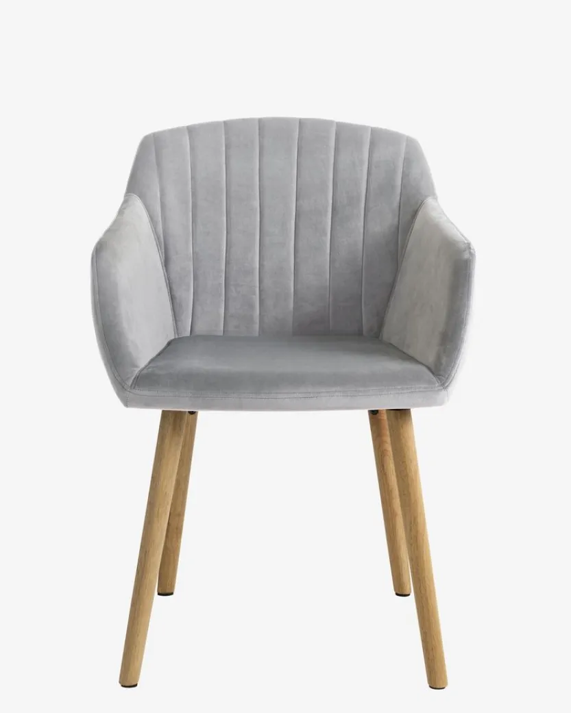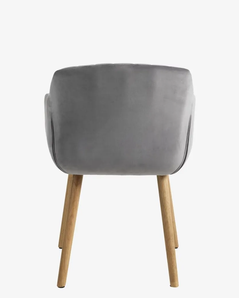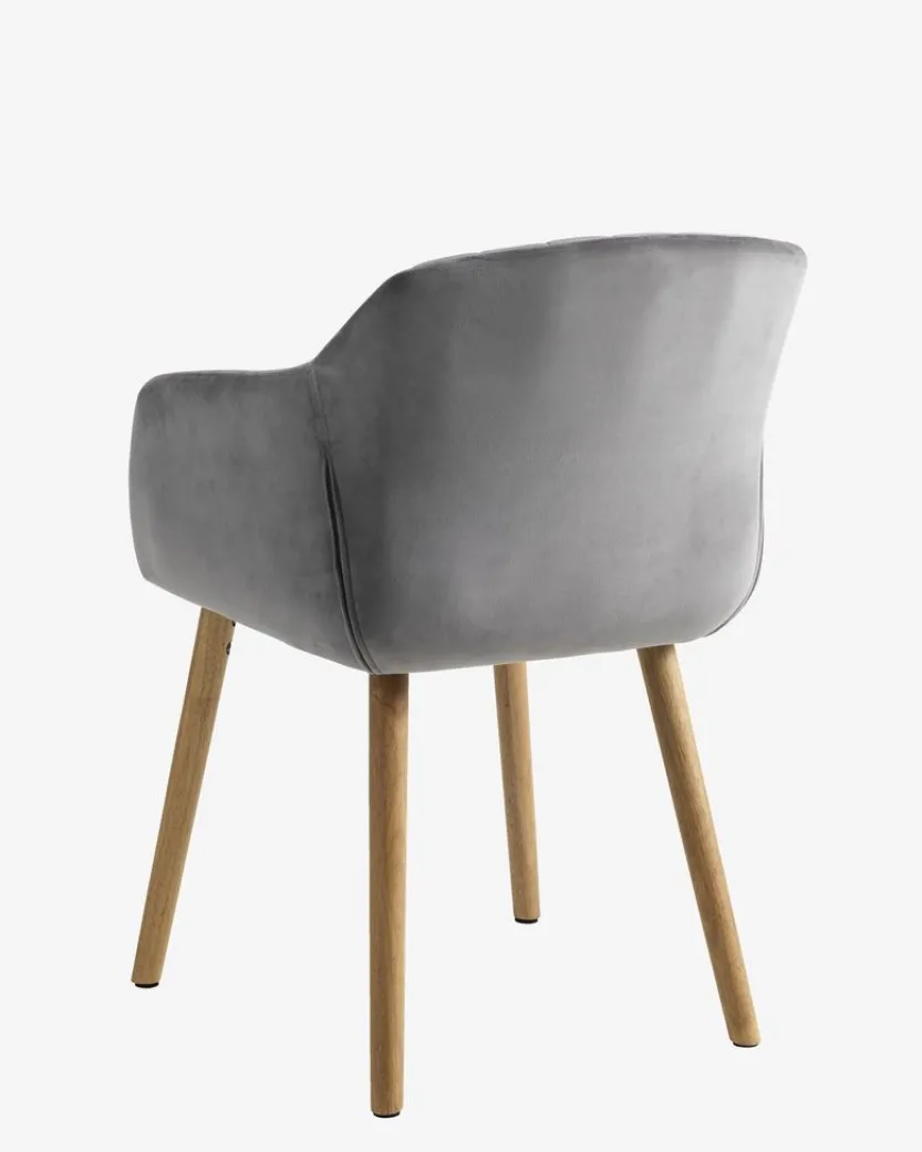 Eetkamerstoel met armleuningen die extra ondersteuning en comfort bieden. De stoel heeft een gecapitonneerde zitting en rugleuning in grijs fluwelen stof. Poten van massief hout.