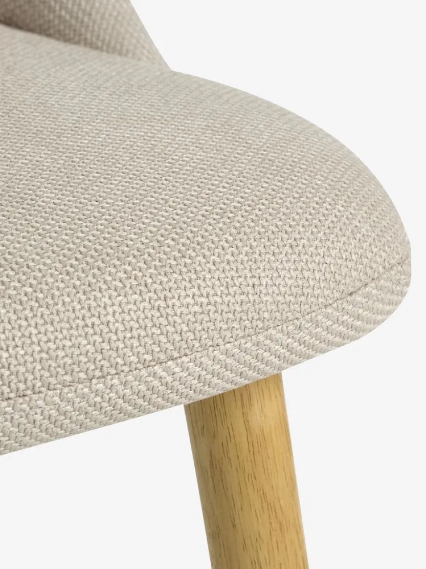 Eetkamerstoel met gecapitonneerde zitting en rugleuning in beige stof. Poten in massief hout.