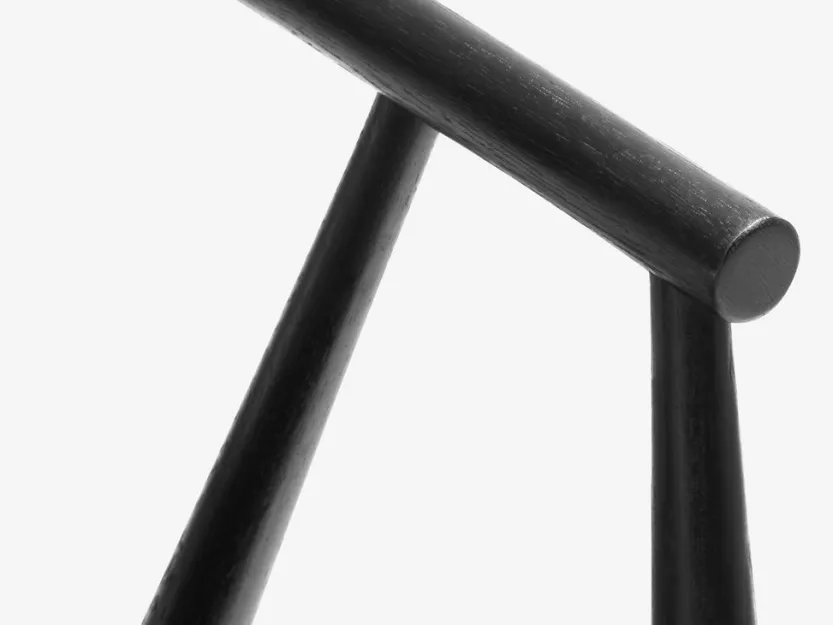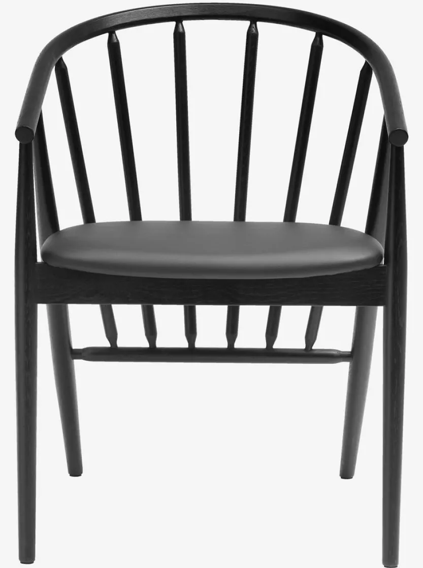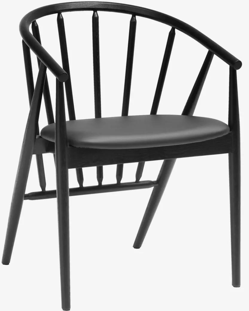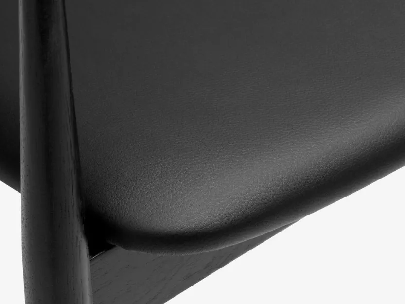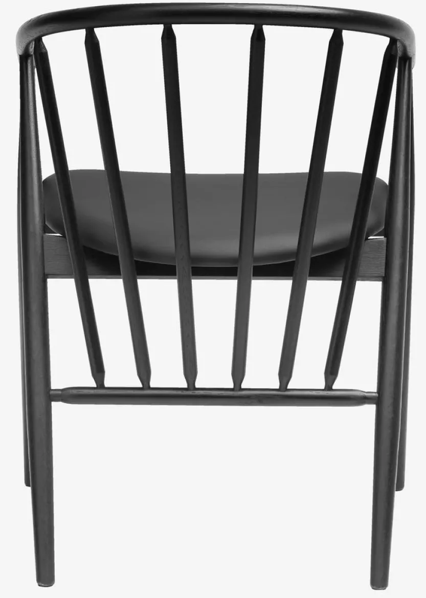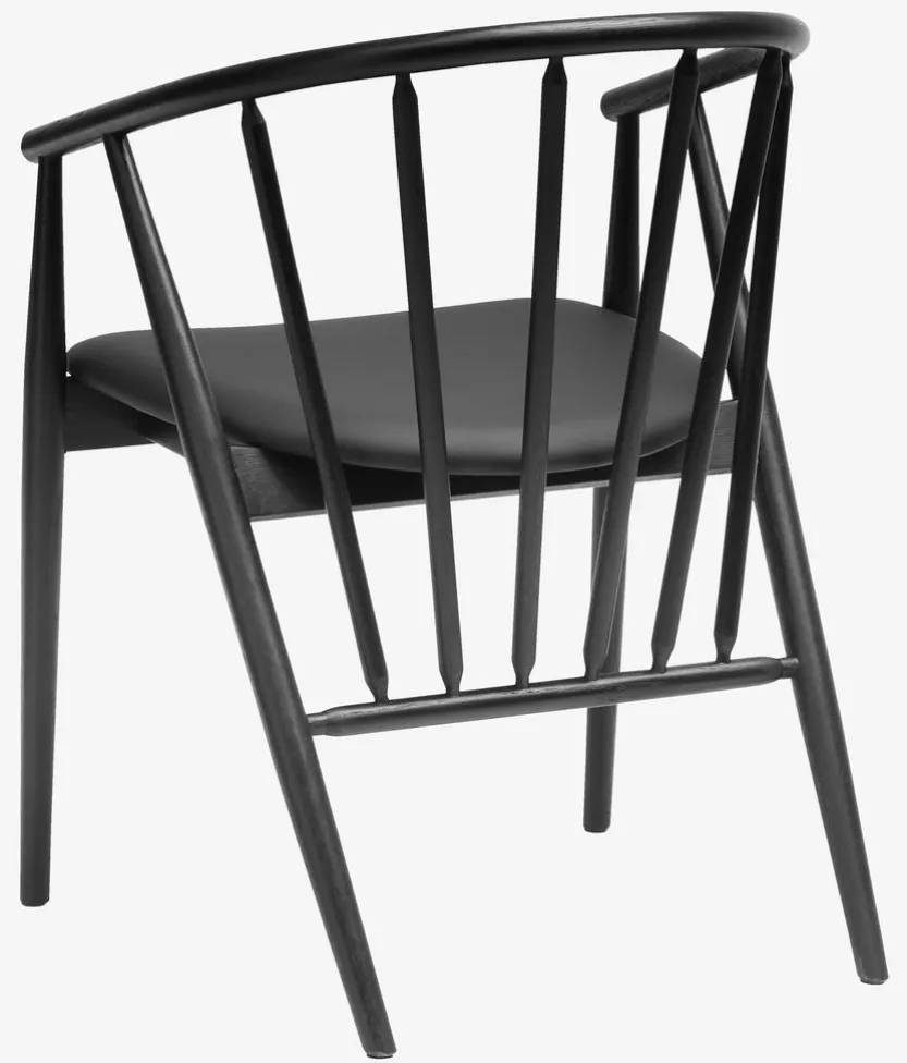 Eetkamerstoel met armleuningen voor extra steun en comfort. De stoel heeft een gecapitonneerde zitting van zwart kunstleer. Bijpassend frame van massief eiken met een gebogen rugleuning.
