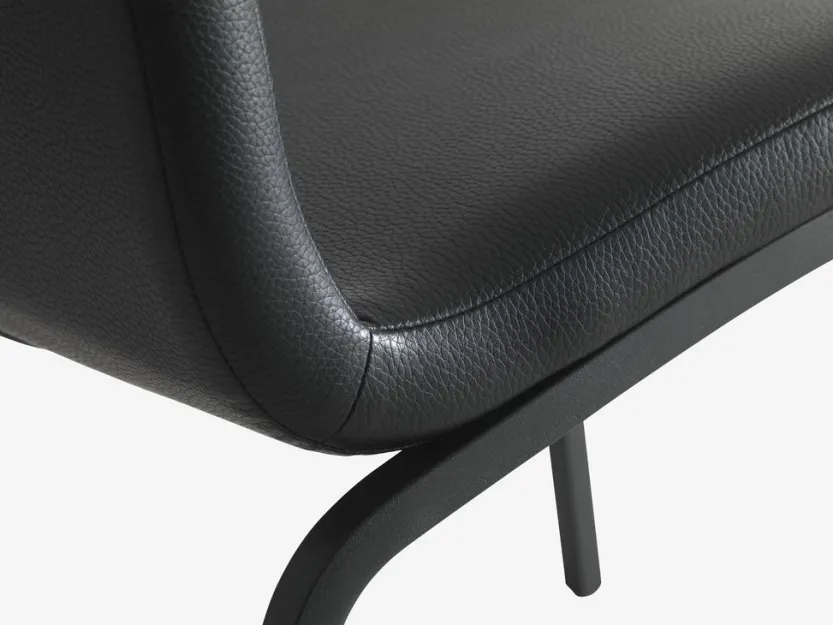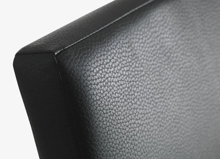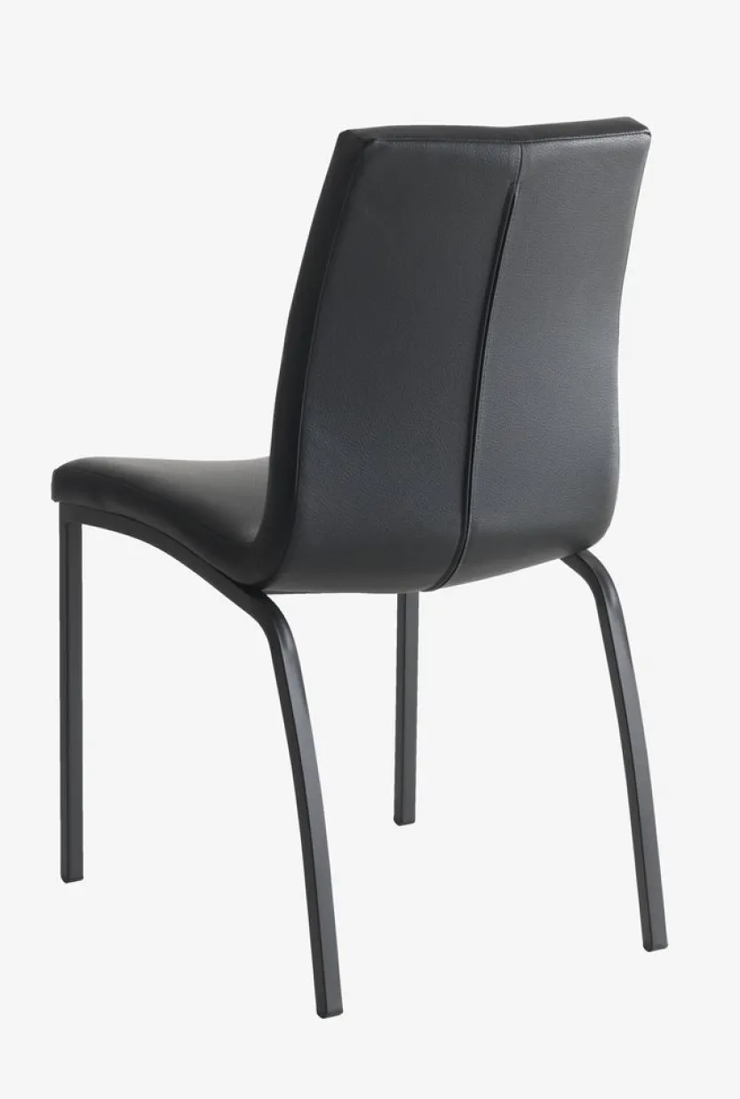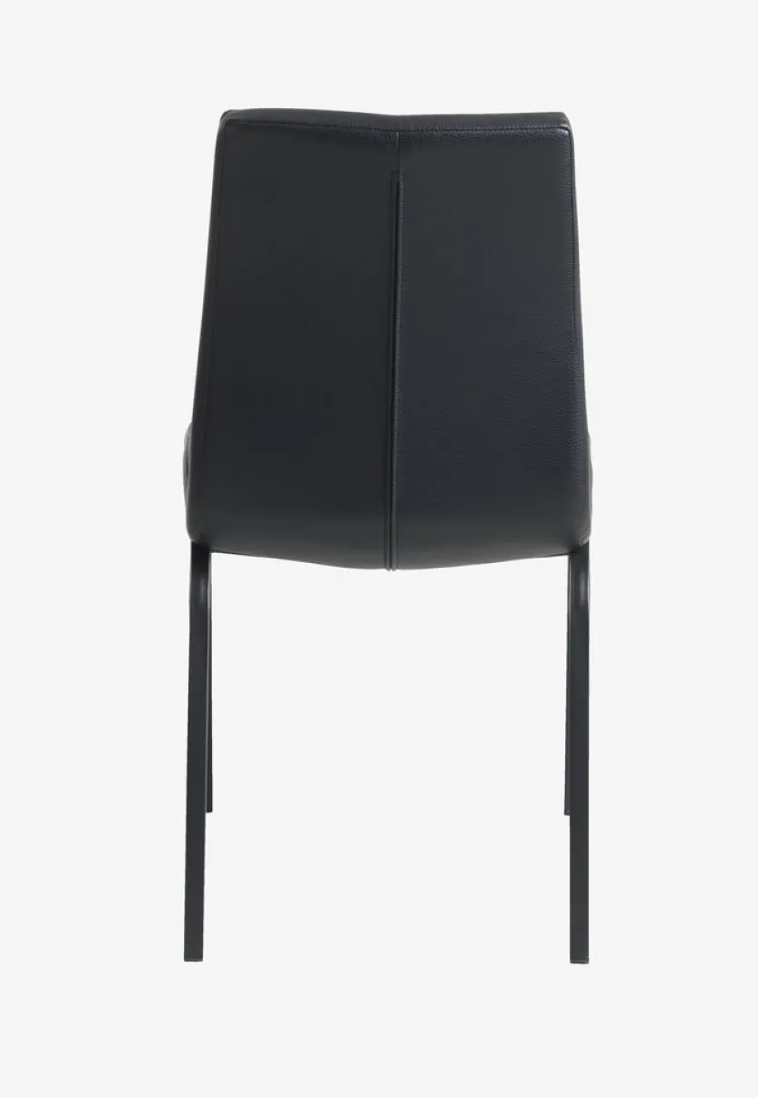 Eetkamerstoel met gecapitonneerde zitting en rugleuning in zwart kunstleer. Bijpassende poten van staal.