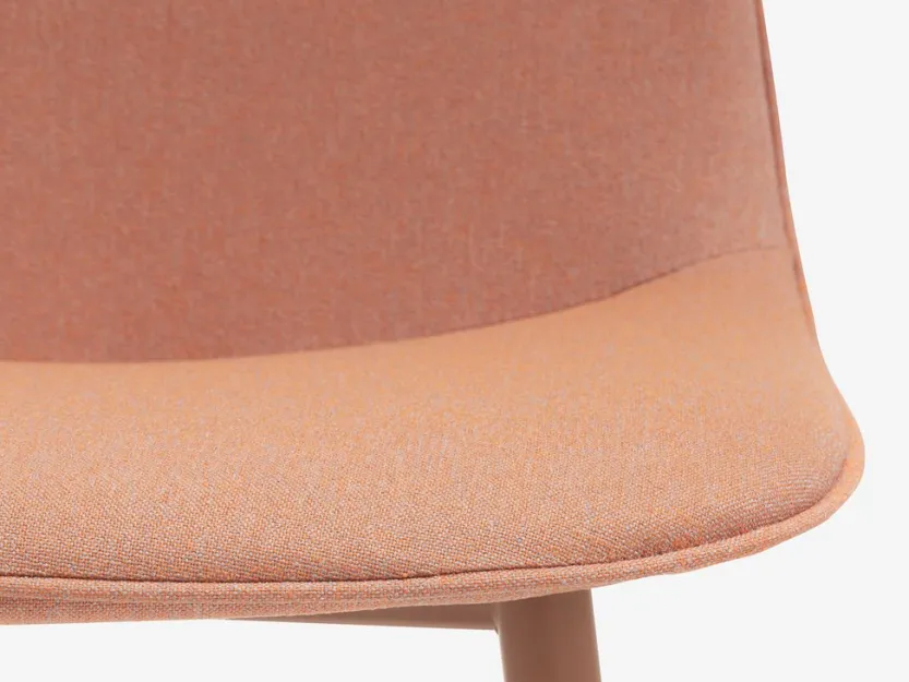 Eetkamerstoel met gecapitonneerde zitting en rugleuning in perzikkleurige stof. Bijpassende poten van staal.
