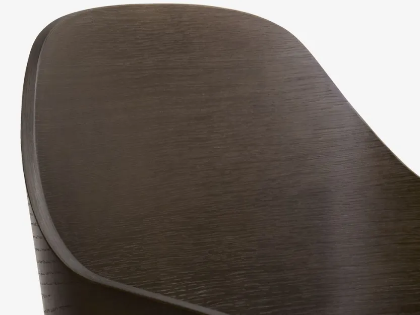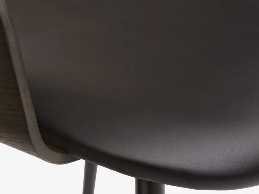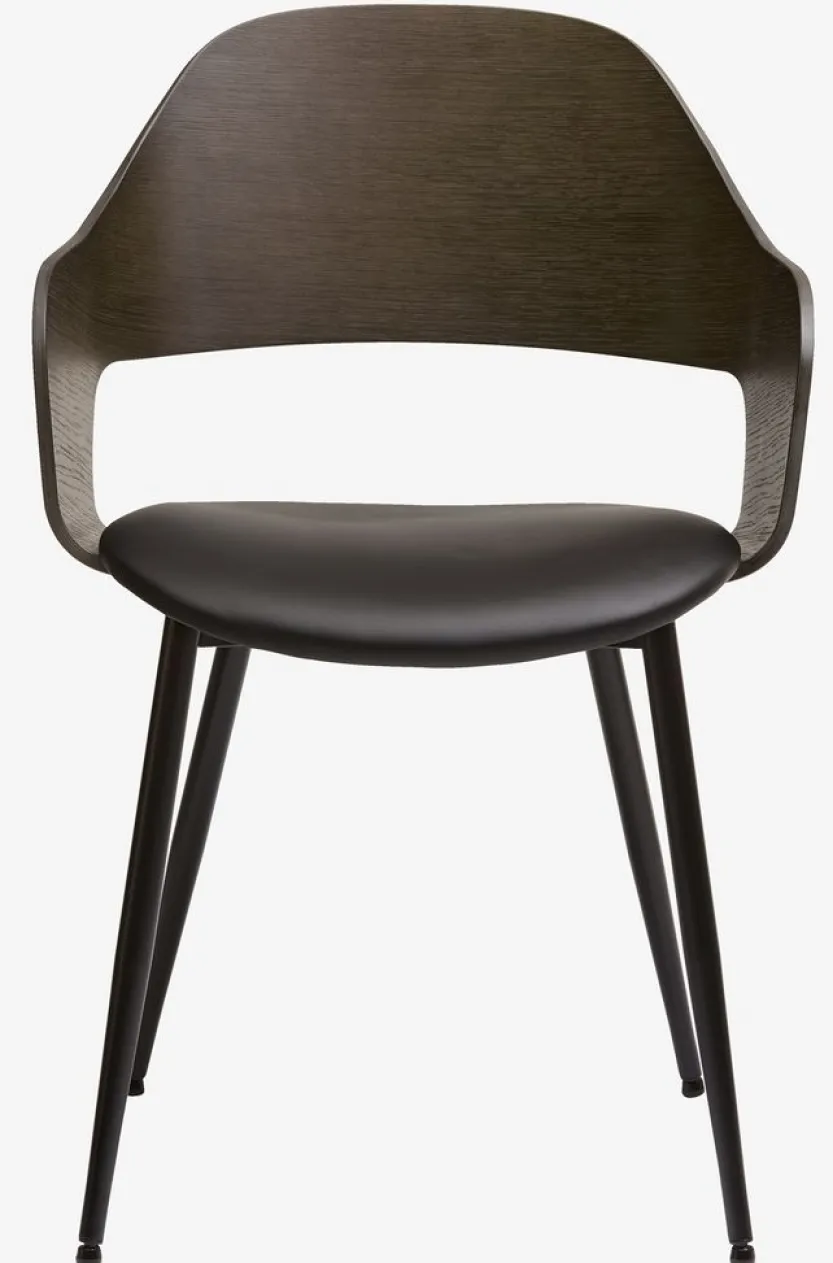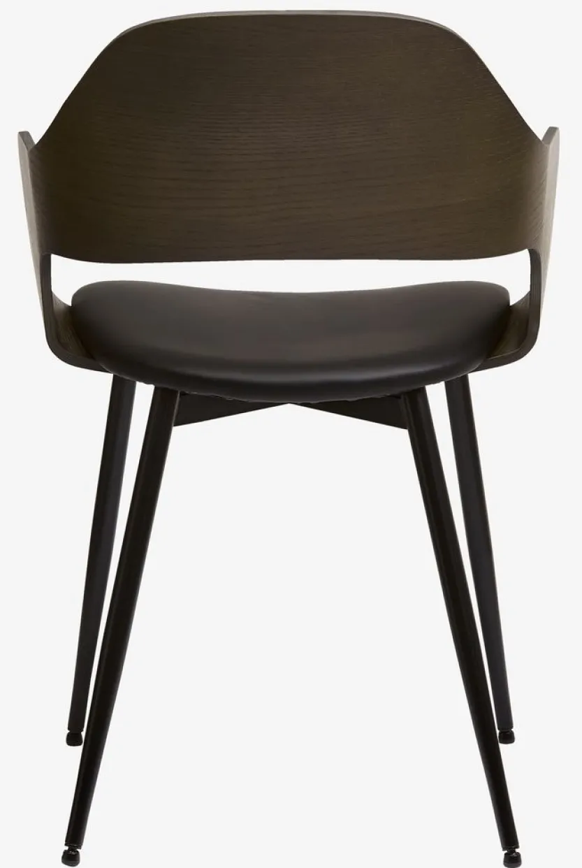 Eetkamerstoel met armleuningen die extra steun en comfort bieden. De stoel heeft een gecapitonneerde zitting van zwart kunstleer en een gebogen rugleuning van donker eiken fineer. Het hout is gelakt voor extra duurzaamheid. Zwarte poten van staal.