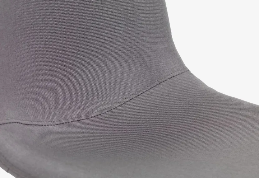 Eetkamerstoel met gecapitonneerde zitting en rugleuning in grijze stof. Poten van staal met eiken look.