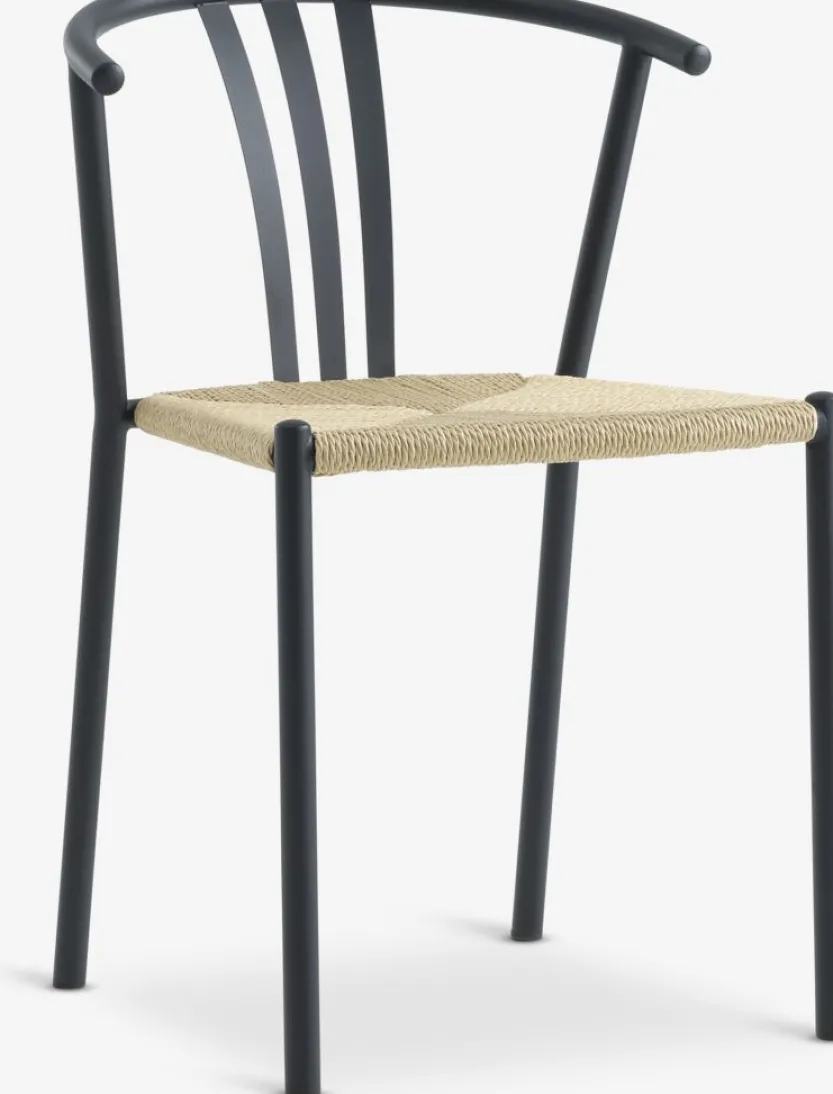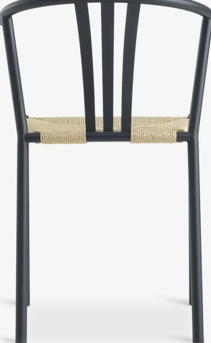 Eetkamerstoel met zitting van geweven papieren koord. Zwart stalen frame met gebogen rugleuning.