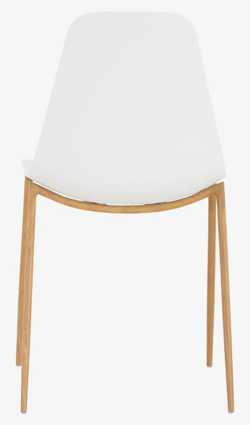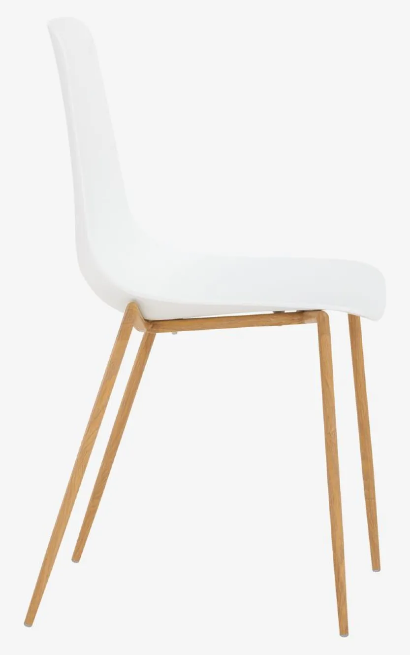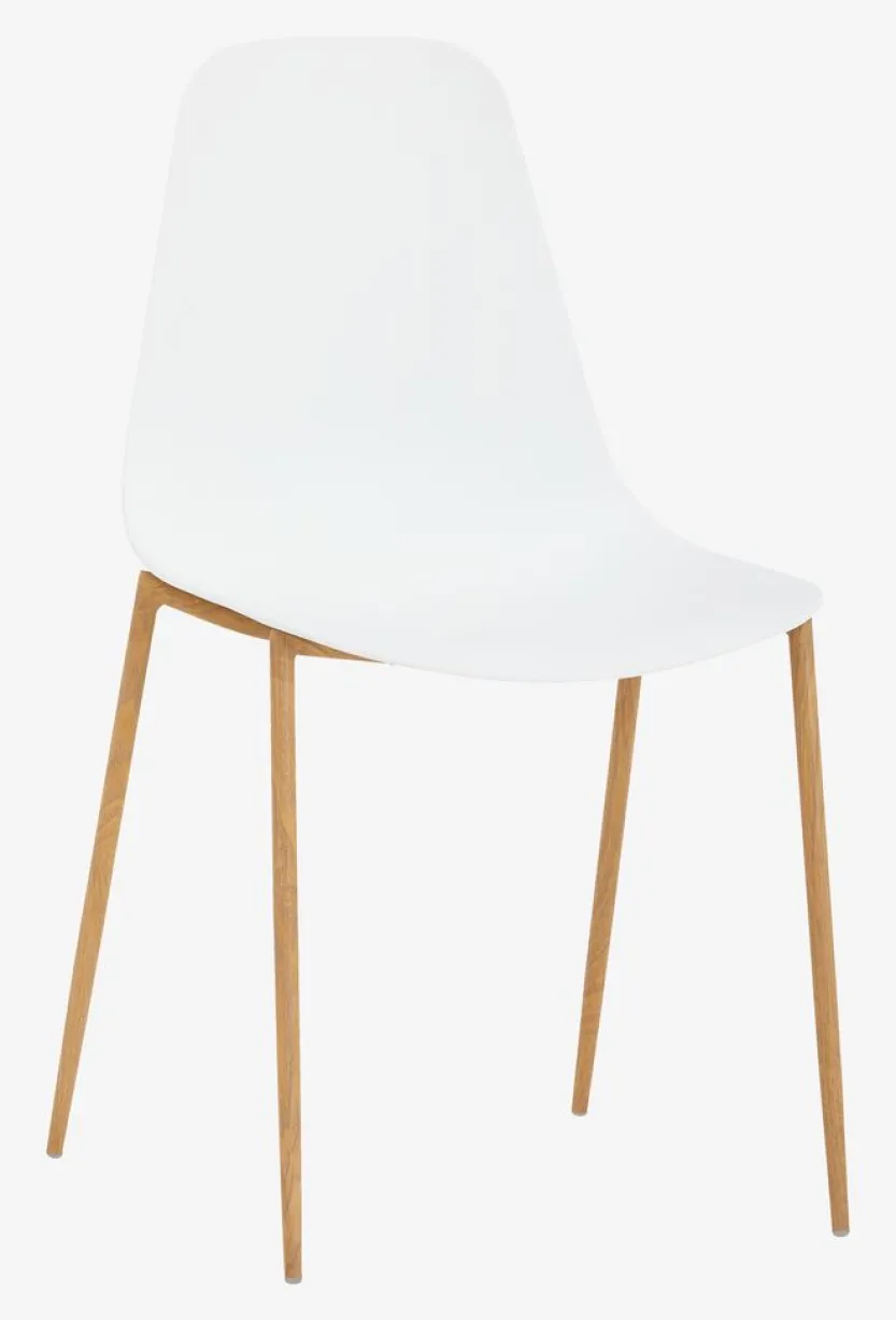 Eetkamerstoel met een witte voorgevormde zitting en poten van staal met een eiken look.
