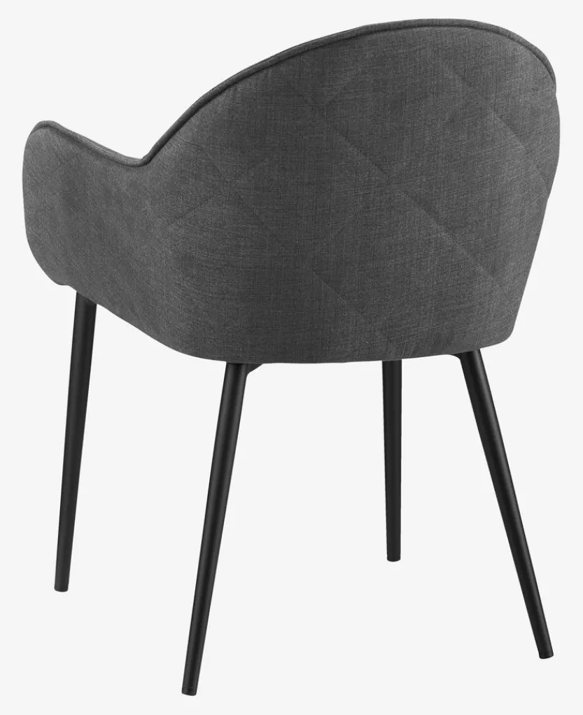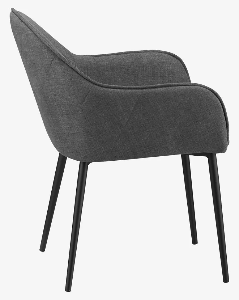 Eetkamerstoel met armleuningen die extra ondersteuning en comfort bieden. De stoel heeft een gecapitonneerde zitting en rugleuning in grijze stof. Zwarte poten van staal.
