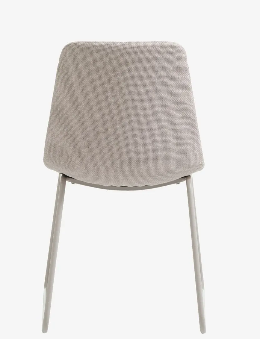Eetkamerstoel met gecapitonneerde zitting en rugleuning in lichtroze stof. Bijpassende poten van staal.