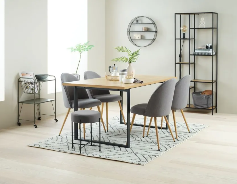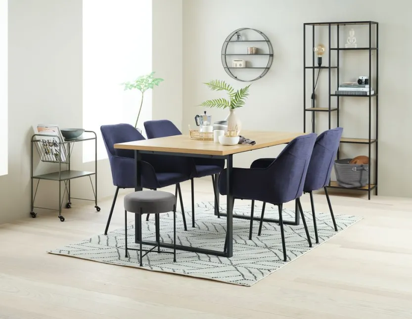 Eettafel met een tafelblad in deco fineer met een eiken look en zwarte stalen poten. B90 x L160 x H75 cm