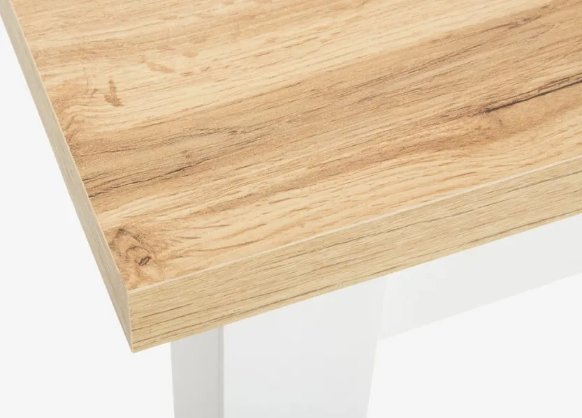 Uitschuifbare eettafel met uittrekmechanisme. Incl. 1 uitschuifblad, dat onder het tafelblad kan worden opgeborgen. De eettafel heeft een tafelblad van deco fineer met een eiken look en witte poten van deco fineer. Je kunt de tafel eenvoudig verlengen tot 193 cm voor grotere gezelschappen. B90 x L150 x H75 cm