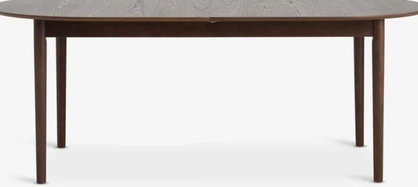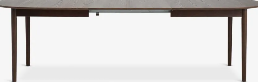 Uitschuifbare eettafel met uittrekmechanisme. Incl. 2 uittrekbladen, die onder het tafelblad kunnen worden opgeborgen. De ovale eettafel heeft een tafelblad van donker eiken fineer en bijpassende poten van massief hout. Het hout is gelakt voor extra duurzaamheid. Je kunt de tafel eenvoudig verlengen tot 240 of 280 cm voor grotere gezelschappen. B100 x L200 x H75 cm