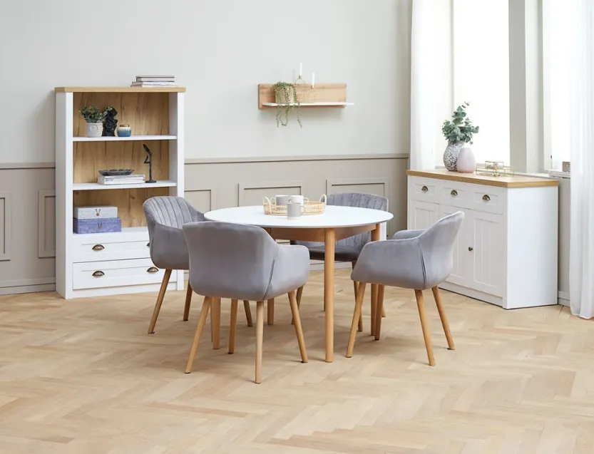 Uitschuifbare eettafel met uittrekmechanisme. Incl. 2 uitschuifbladen. De ronde eettafel heeft een wit tafelblad van MDF en poten van massief hout. Het hout is gelakt voor extra duurzaamheid. Je kunt de tafel eenvoudig verlengen tot 200 cm voor grotere gezelschappen. Ø110 x H75 cm