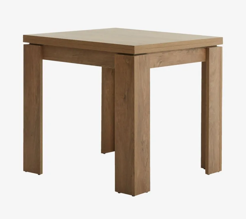 Eettafel in deco fineer met eiken look. Met het uitklapbare verlengblad kun je de lengte van het tafelblad eenvoudig verdubbelen tot 160 cm. B80 x L80 x H76 cm