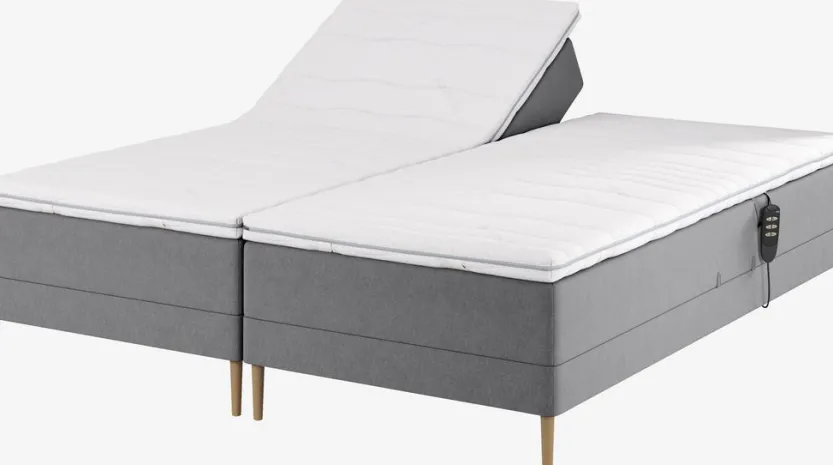 Verstelbaar bed 90×200 cm met afstandsbediening. 1 matras met ingebouwde verstelbare bodem en pocketveren 240/m², gevuld met polyetherschuim. Het matras is verdeeld in 7 comfortzones die een unieke, ergonomisch correcte ondersteuning bieden. 1 topmatras, 6 cm dik met een kern van polyetherschuim. Wasbare tijk, die is behandeld met verzachtende aloë vera. Incl. poten. Excl. hoofdbord.
