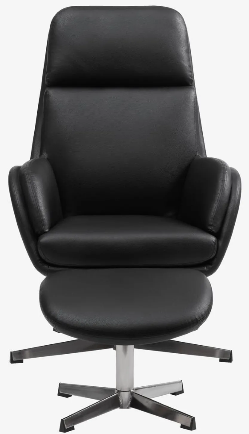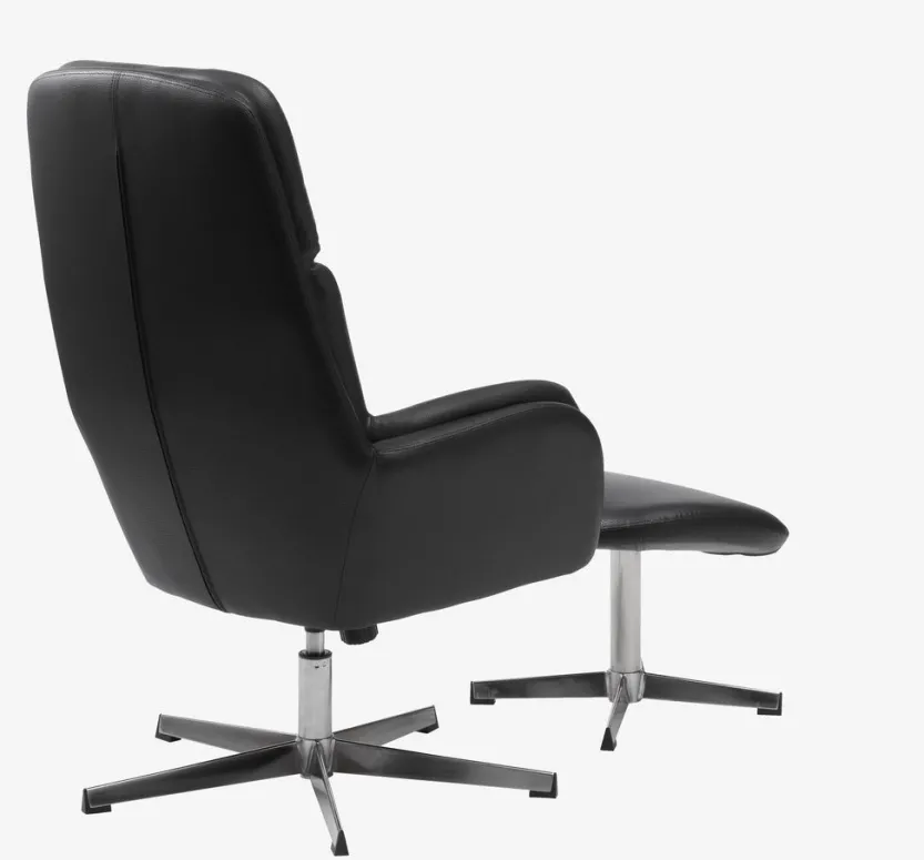 Kunstleer. Zit- en rugkussens in schuim. Met draaivoet in chroom en traploos kantelmechanisme. Incl. voetenbankje. B70 x H107 x D119 cm