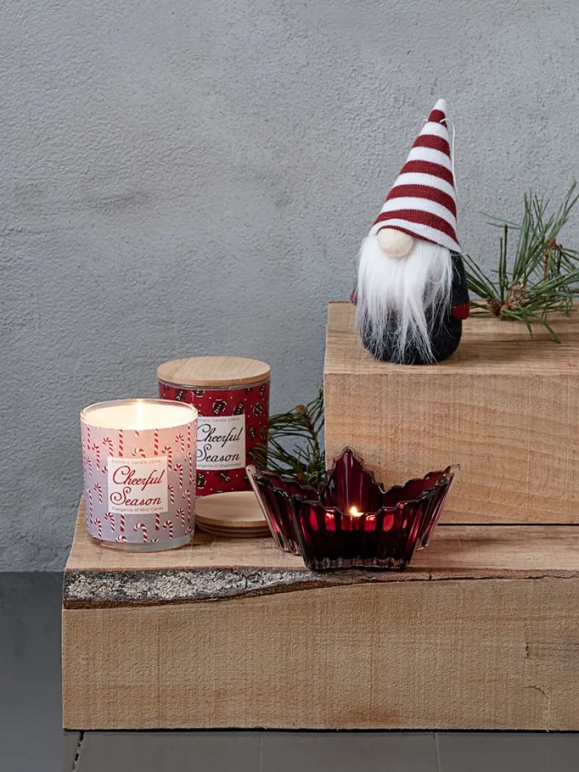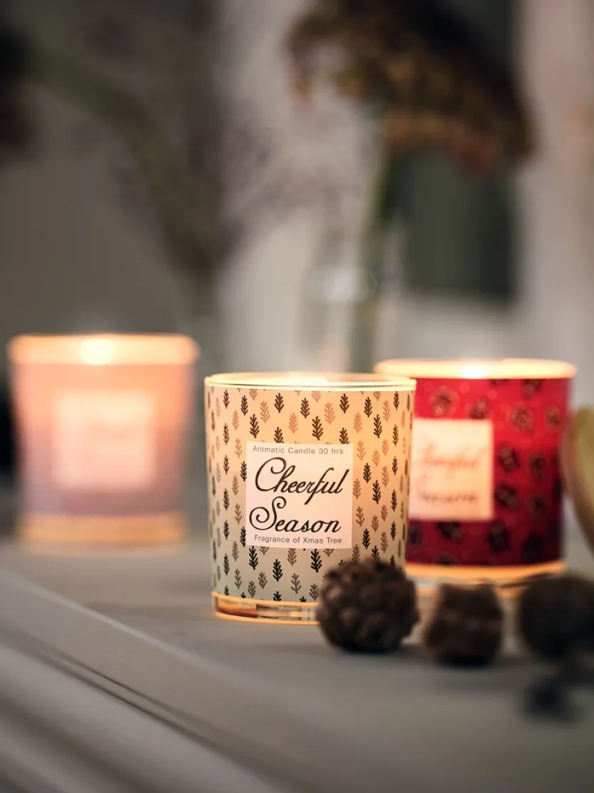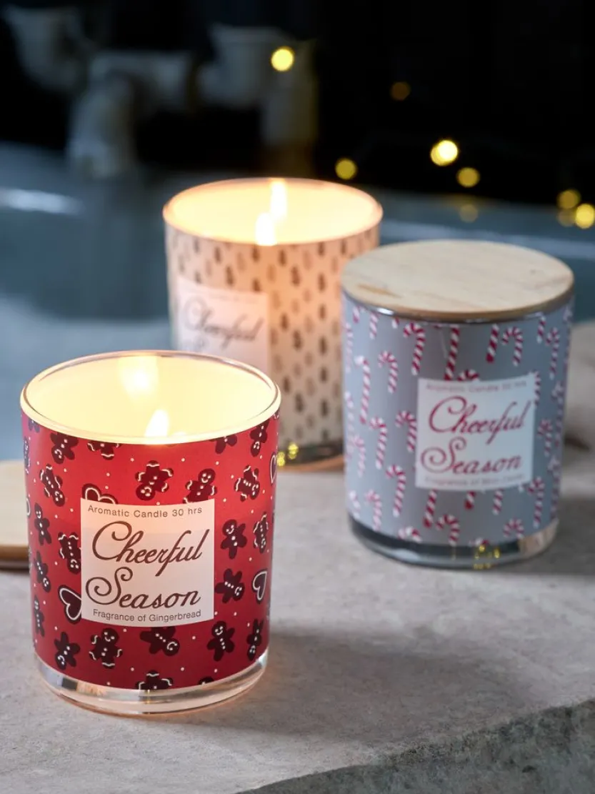 Set van drie geurkerstkaarsen met houten deksel. De kaarsen zijn beschikbaar in drie kleuren: groen, grijs en rood. Elke kaars heeft een prachtig kerstontwerp en verspreidt een heerlijke geur, perfect om een feestelijke sfeer te creëren in je huis. Brandduur van 30 uur per kaars. Ø7 x H8 cm.