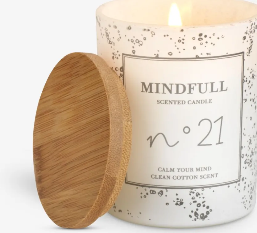 Witte geurkaars met een frisse katoengeur. De kaars zit in een glazen pot met een bruin bamboe deksel. Hij brandt tot 20 uur en is ideaal om een ontspannen sfeer in huis te creëren. Ø7 x H9 cm