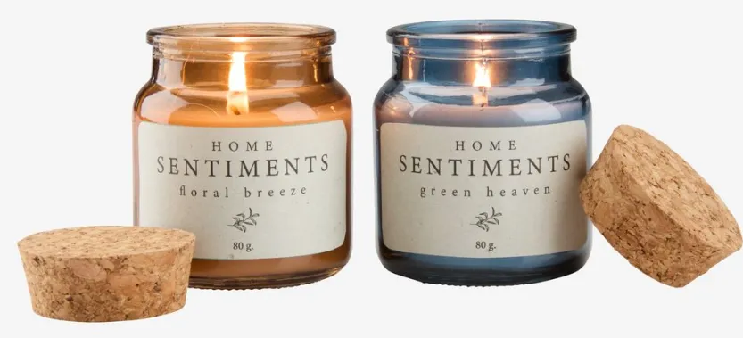 Geurkaars in een elegante glazen pot met een kurken deksel. Elke kaars verspreidt een aangename geur en heeft een brandtijd van 20-24 uur. Ideaal voor het creëren van een gezellige sfeer in elke ruimte. Beschikbaar in oud blauw en latte. Ø6 x H8 cm