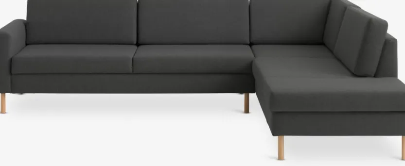 4-zits hoekbank van stof. Zit- en rugkussens van schuim. Poten van massief beuken. Kan niet worden gespiegeld. B280 x H81 x D87/226 cm
