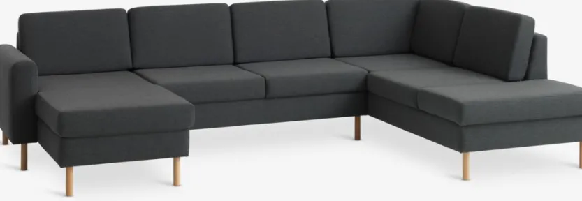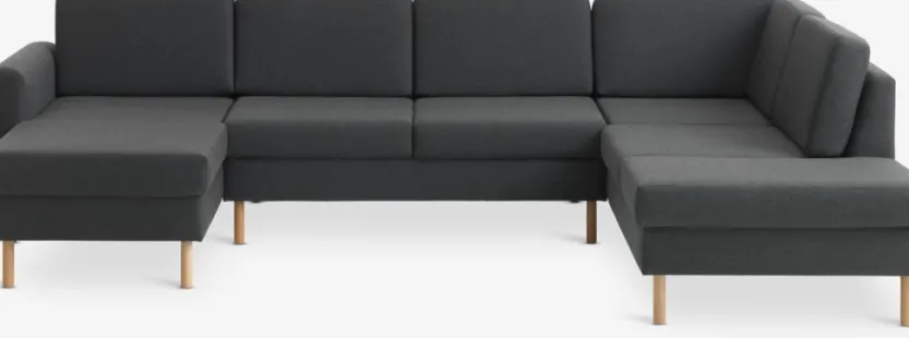 6-zits hoekbank van stof. Zit- en rugkussens van schuim. Poten van massief beuken. Kan niet worden gespiegeld. B300 x H81 x D87/155/205 cm
