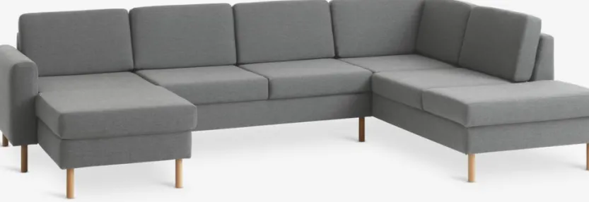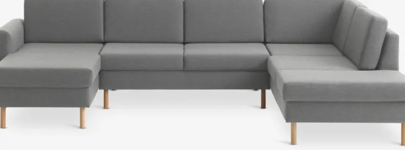 6-zits hoekbank van stof. Zit- en rugkussens van schuim. Poten van massief beuken. Kan niet worden gespiegeld. B300 x H81 x D87/155/205 cm