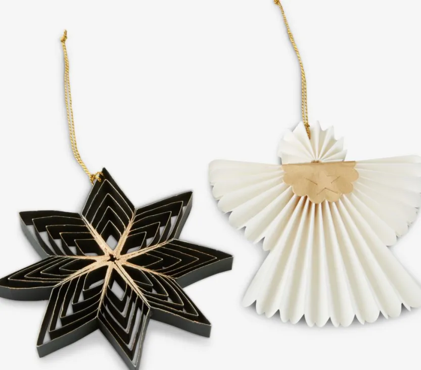 Set van twee kerstdecoraties waaronder een ster en een engel met papieren vouwen die een prachtig visueel effect creëren. Beide decoraties zijn voorzien van een ophangkoord om ze gemakkelijk in de kerstboom of in huis te hangen. B11/10 x L1/1 x H11/10 cm