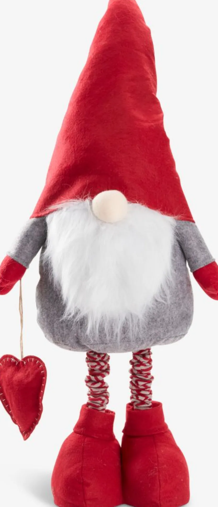 Grijze en rode kerstelf met een speels ontwerp. Deze elf heeft een lange rode muts, een grijze outfit en een witte baard. Hij houdt een rood hart vast, wat een schattig detail toevoegt aan zijn uiterlijk. Perfect om je huis tijdens de feestdagen te decoreren. B36 x L16 x H84-128 cm.