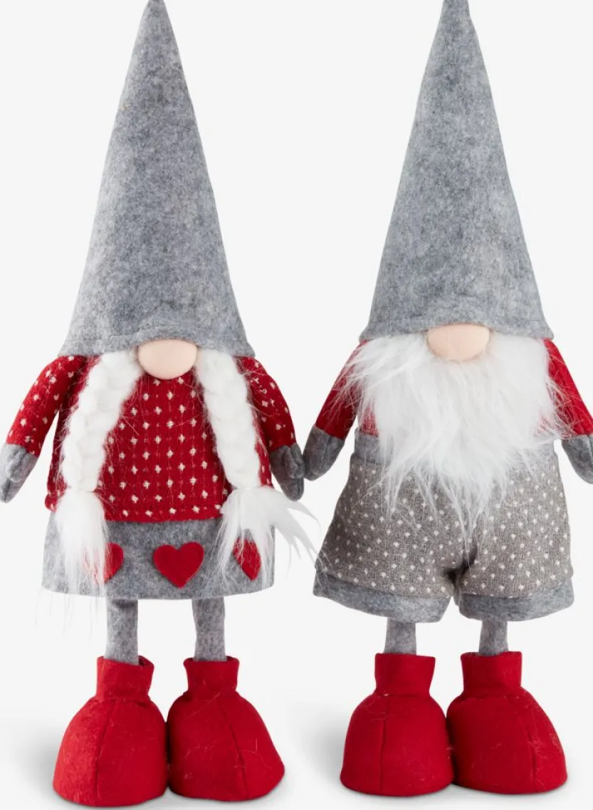 Set van twee kerstelfen in grijs en rood. Deze charmante figuren hebben een speels ontwerp met lange puntmutsen en grote rode schoenen. De ene elf draagt een rode trui met stippen en een grijze broek met hartjes, terwijl de andere een grijze trui met stippen en een rode broek draagt. Beide elfen hebben witte baarden en een gezellige uitstraling, perfect voor het creëren van een feestelijke sfeer in huis. H43 cm
