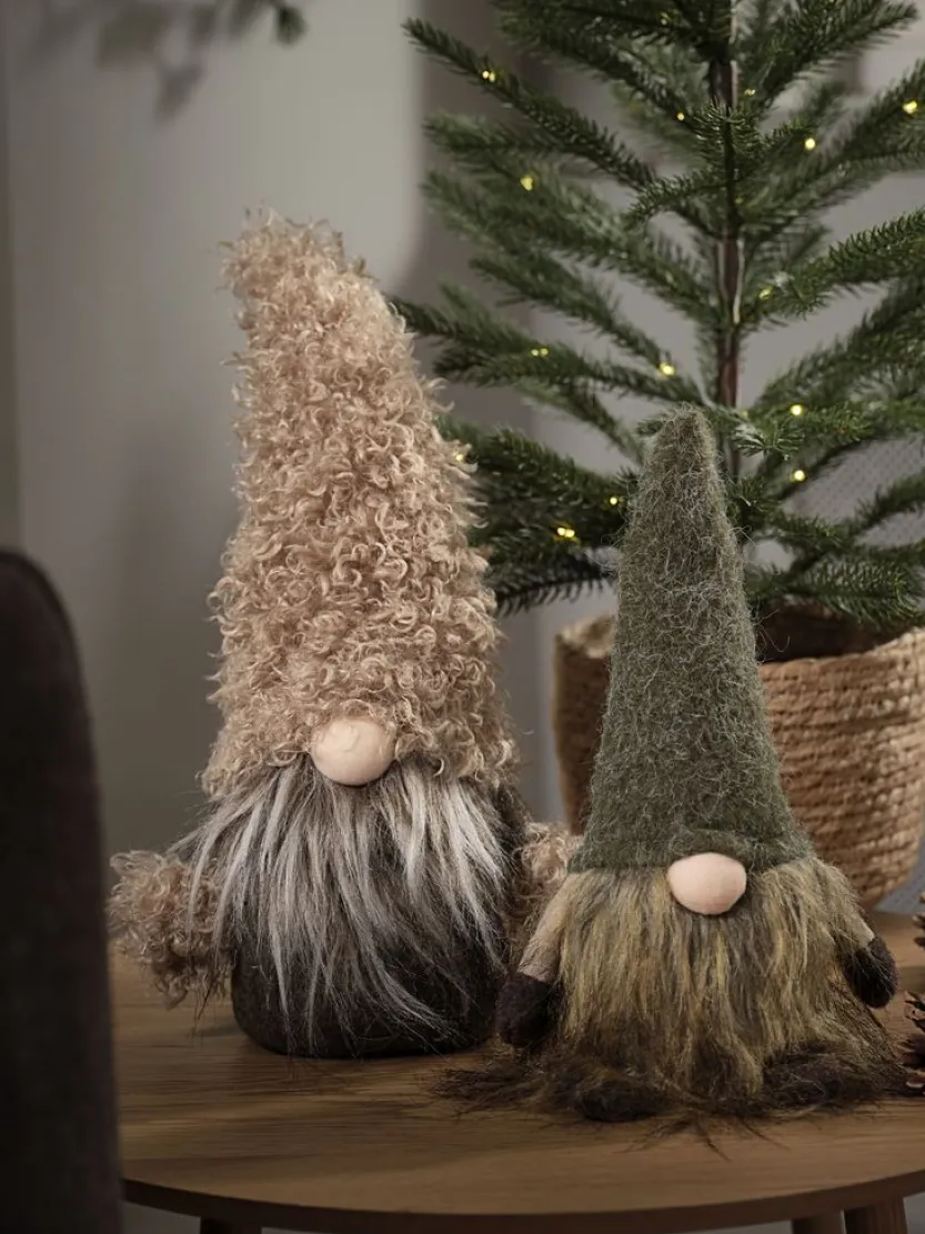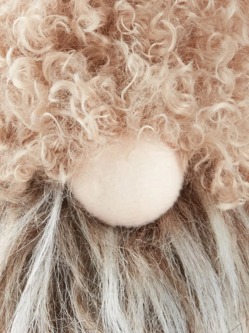 Beige en bruine kerstelf met een speels ontwerp. Deze kerstelf heeft een grote, pluizige hoed en een lange witte baard, wat hem een charmante en feestelijke uitstraling geeft. Perfect om binnenshuis te decoreren tijdens de feestdagen en een gezellige sfeer te creëren. B13 x L20 x H41 cm