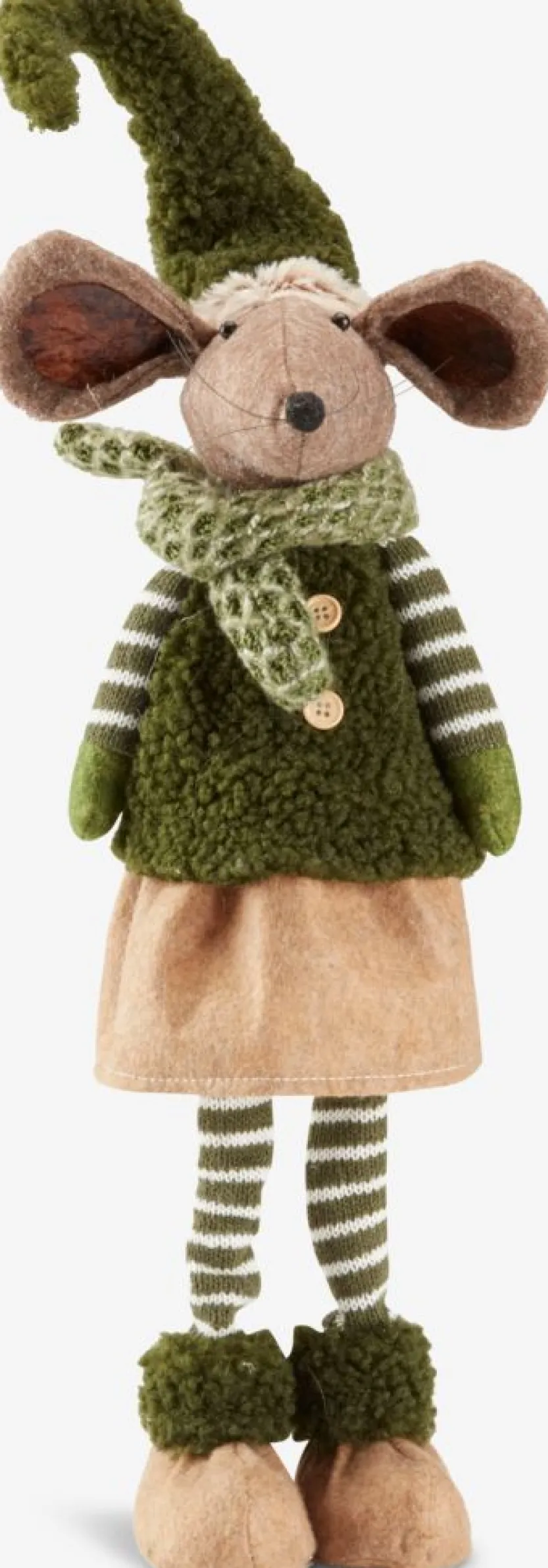Charmante kerstmuis in groene en bruine kleuren, waardoor het een perfecte aanvulling is voor degenen die de voorkeur geven aan kerstdecoraties met een natuurlijk thema. B17 x L15 x H60 cm