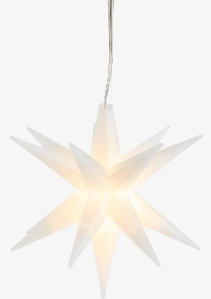 Witte kerstster met LED-verlichting en timerfunctie. Deze ster is perfect voor het creëren van een warme en feestelijke sfeer binnenshuis. De ingebouwde timer schakelt de verlichting automatisch aan en uit, met 6 uur aan en 18 uur uit. De kerstster werkt op 2 AA-batterijen (niet inbegrepen) en heeft een brandduur van 20.000 uren. De lengte van de kabel vanaf het stopcontact tot de eerste lamp is 0,5 meter, en de totale lengte is 0,62 meter. Ø12 cm.