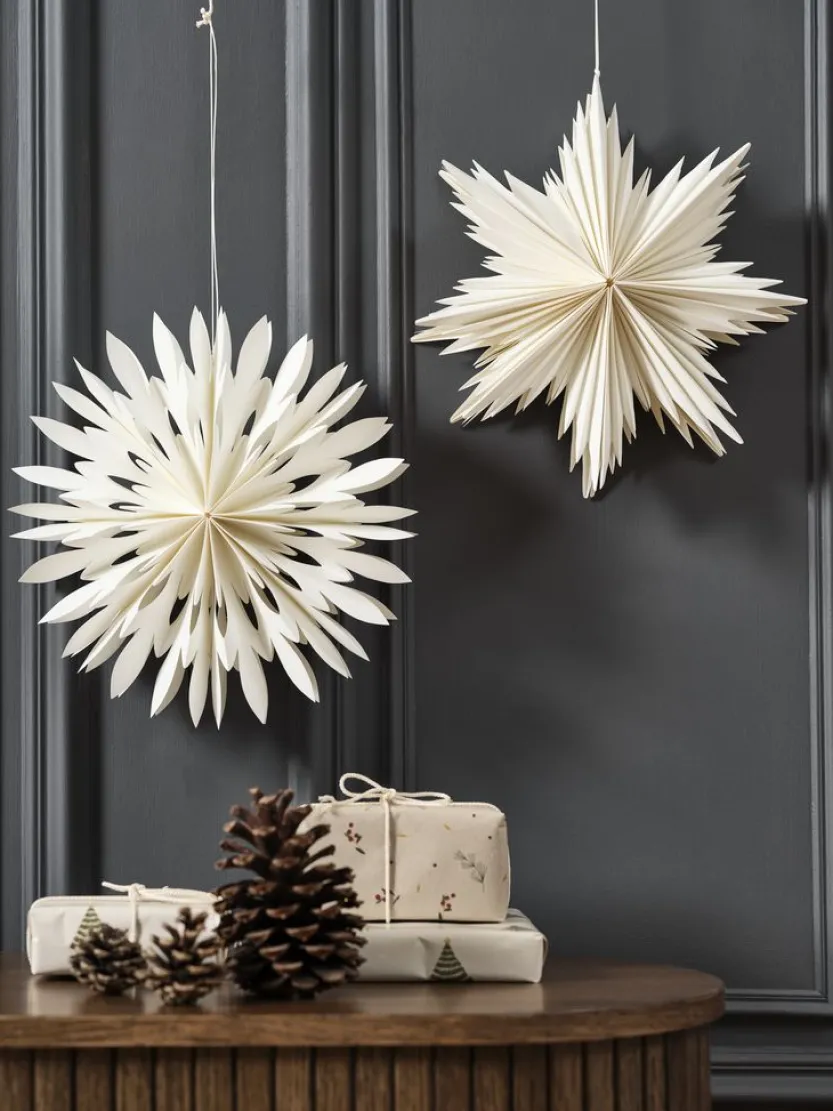 Witte kerstster met papieren vouwen die een prachtig visueel effect geven. Beschikbaar in verschillende designs voor extra variatie. Ø30 x H8 cm