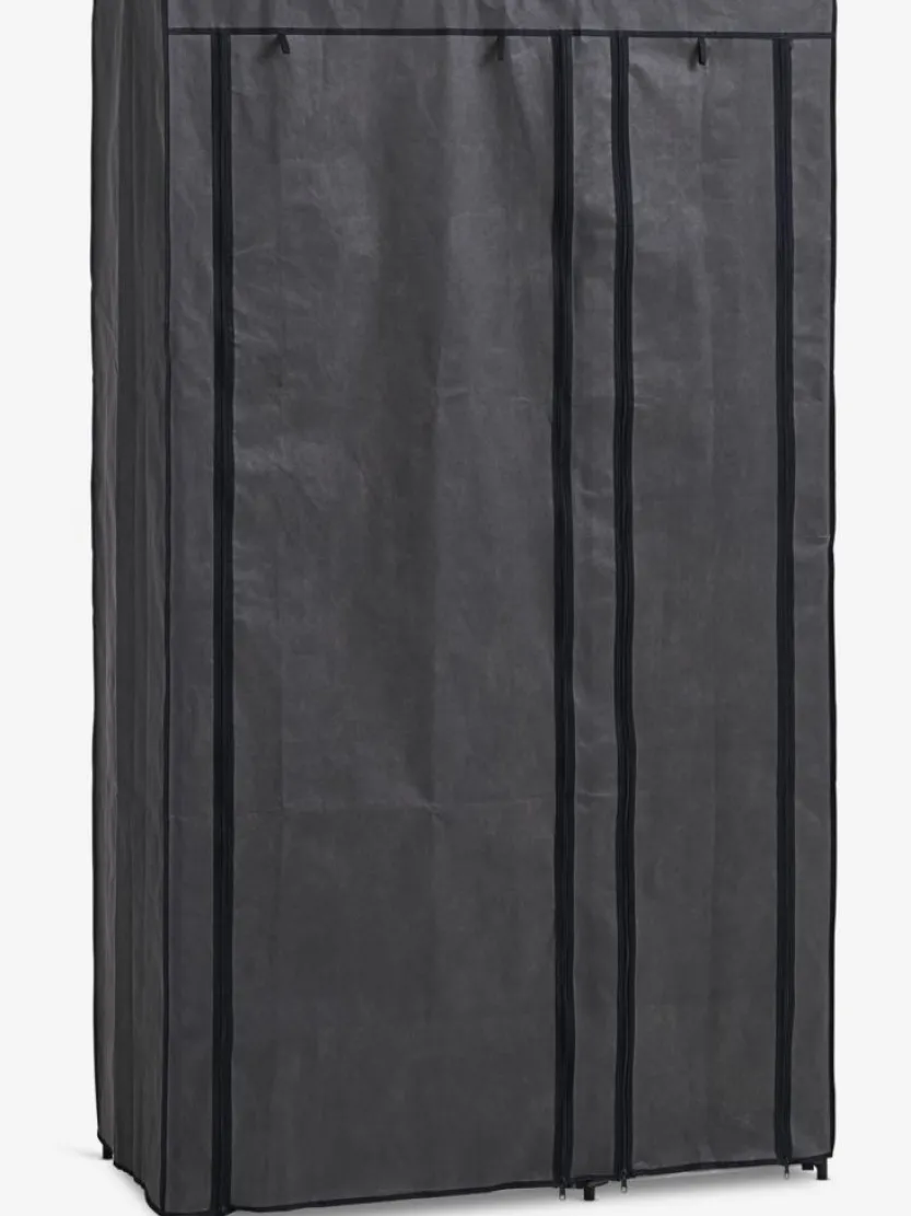 Staal en stof. Kastindeling: 4 schappen en 1 kledingroede. B100 x H174 x D46 cm