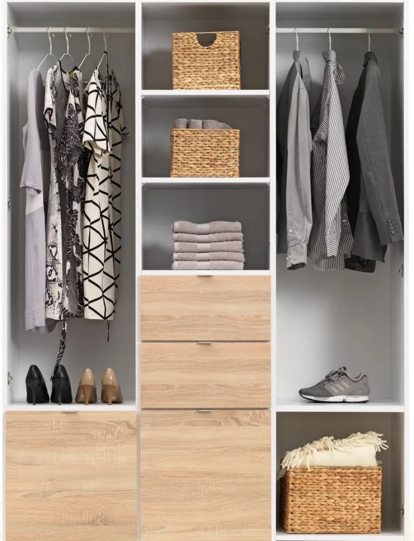 Deco fineer. Kledingkast inrichting: 2 schappen en 2 kledingroedes. B149 x H200 x D50 cm